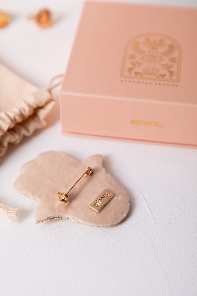 All The Ways To Sayのブローチはインドの職人の手によって愛情を込めて刺繍されています。金色のカネティールワイヤー、きらめくビーズ、繊細なストラスを組み合わせ、遊び心と上品さを兼ね備えたデザインです。ゴールドのディテールが施された紙製ハードケースとコットンポーチに入れてお届け。
