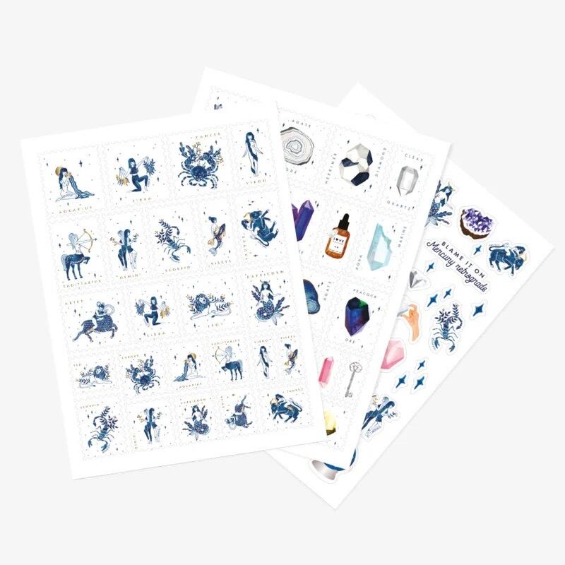 星座、クリスタル、その他の神秘的なシンボルを、魅惑的な青と紫の色合いでデザインしました。日記帳や手帳、手紙、プランナーなどの装飾に最適で、触れるものすべてに宇宙的でスピリチュアルな雰囲気を添えます。